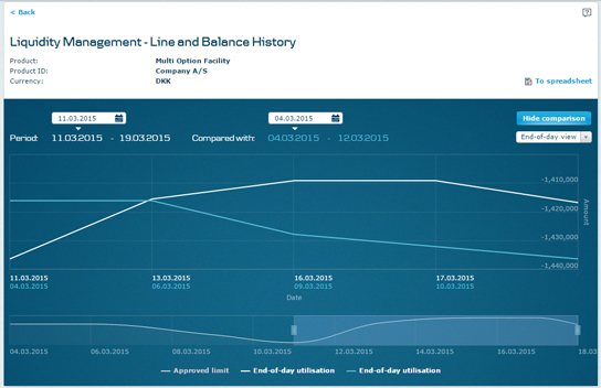 Now you can select a comparison period in the graphical view of your line and balance history. Click on the graph icon, either on the liquidity overview screen or on the account balance history screen, and choose “Show comparison” in the upper right corner. Use the calendar icon to select the desired comparison period.