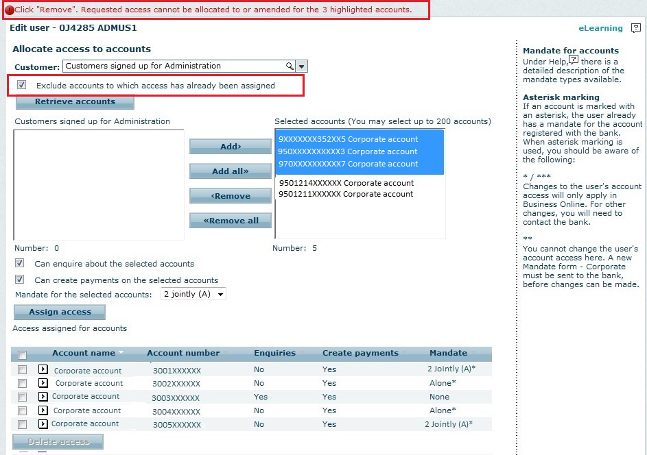 - the administrators can exclude accounts to which users have already been assigned “Enquire” or “Create payments” access, and