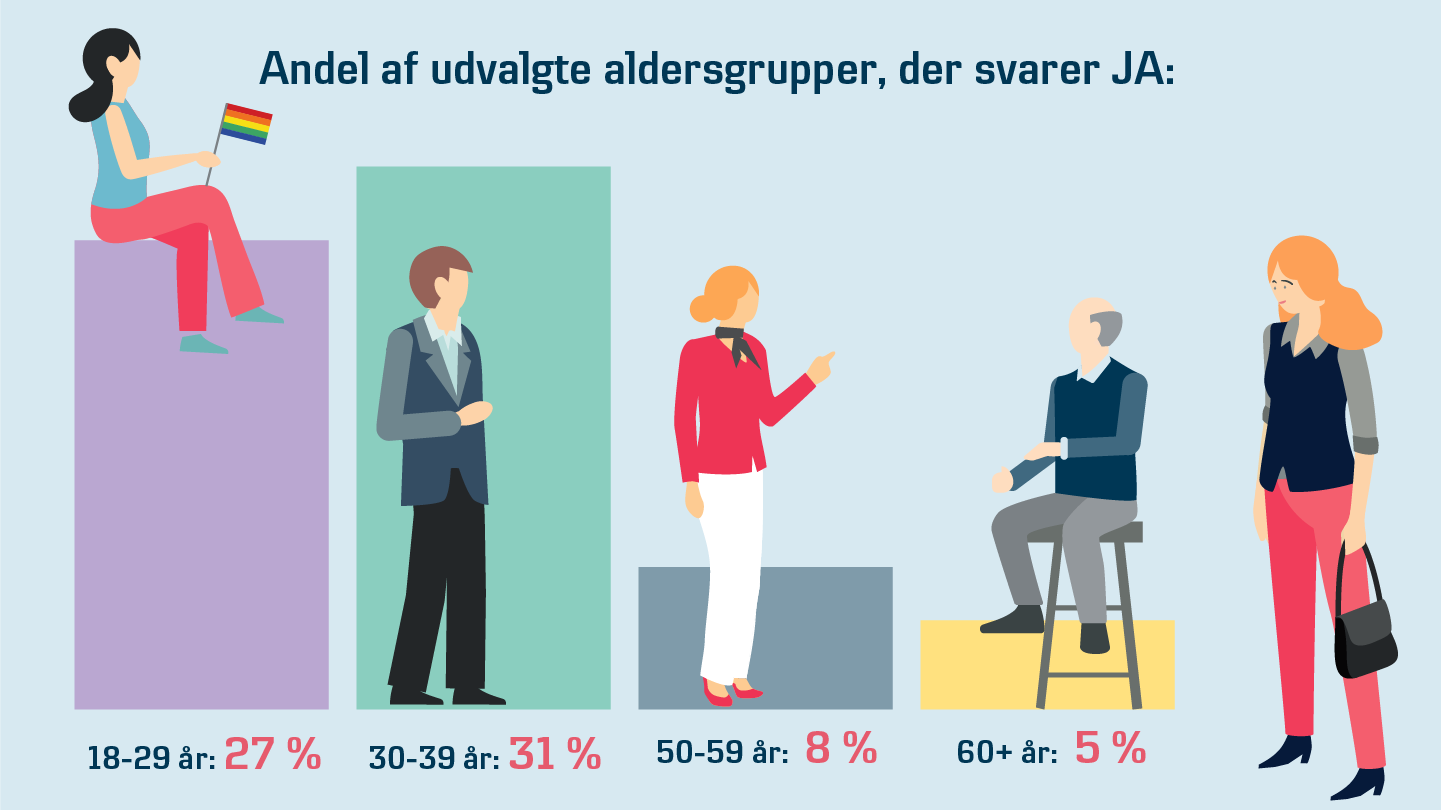 Cirka halvdelen af alle LGBT+-personer skjuler nemlig deres identitet af frygt for stigma og diskrimination, viser undersøgelser fra den internationalt anerkendte og ledende NGO Stonewall (2017). Samtidig svarer hver fjerde 18-29-årige (24 %) i en ny undersøgelse, som YouGov har lavet for Danske Bank, at de har oplevet at blive usikre på personer med en anden kønsidentitet, hvis de eksempelvis mødte dem på gaden, i offentlig transport eller på biblioteket.
