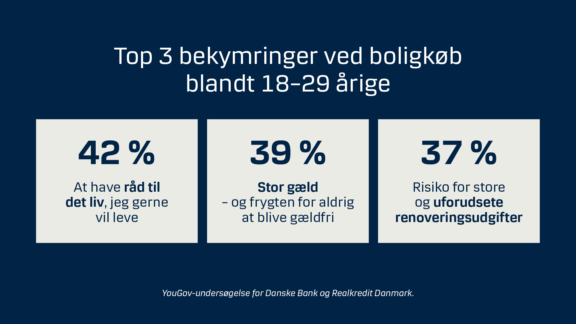 En ny undersøgelse, som YouGov har foretaget for Danske Bank og Realkredit Danmark, viser, at den største bekymring ved boligkøb blandt 18-29-årige er, om de har råd til at leve det liv, de gerne vil (42 %). Derefter følger frygten for at stifte stor gæld og aldrig blive gældfri (39 %) og dernæst risikoen for store udgifter til renovering (37 %).