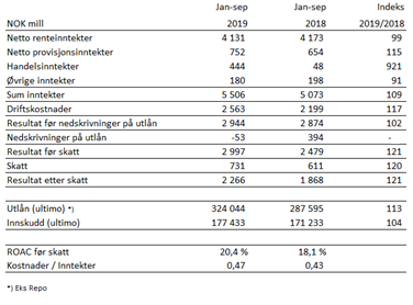 – De tre første kvartalene av 2019 har vært preget av solid drift og god aktivitet. Kundeveksten har vært tilfredsstillende, både med hensyn til privat- og bedrifts-satsningen vår, og det er gledelig å se at stadig flere nordmenn velger oss som sin bankforbindelse. Samtidig opplever norske banker fremdeles et betydelig press med hensyn til marginene på boliglån, noe selvsagt også vi merker på kroppen, sier landesjef Trond F. Mellingsæter.