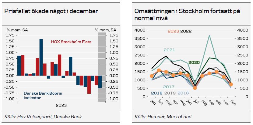 ”Prisfallet på Stockholms bostadsrätter accelererade något i december. En starkare ekonomi, lägre inflation och fallande räntor kommer att ge stöd åt priserna framöver. Stabila till svagt stigande priser framstår som mer troligt än en förnyad påtaglig prisnedgång.”