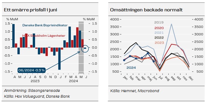 Även om bostadspriserna föll lite i juni och kanske även gör det i juli så ser vi detta som en temporär, säsongsbetonad nedgång. I synnerhet nu när Riksbanken gläntat på dörren för eventuellt tre ytterligare räntesänkningar under hösten. Detta är förstås goda nyheter för bolånetagare som därmed kan se fram emot lägre räntekostnader. Vi ska lägga till att vi ser en något lägre inflation än Riksbankens nya prognos, vilket kan ge ytterligare press ner på räntorna. Precis som tidigare är vi optimistiska om hushållens finansiella ställning, både vad gäller realinkomstutveckling och finansiell nettoförmögenhet, stabil sysselsättning, stigande reallöner och stigande finansiell förmögenhet. Tillsammans kommer alla faktorer bidra till högre bostadspriser i år och 2025.